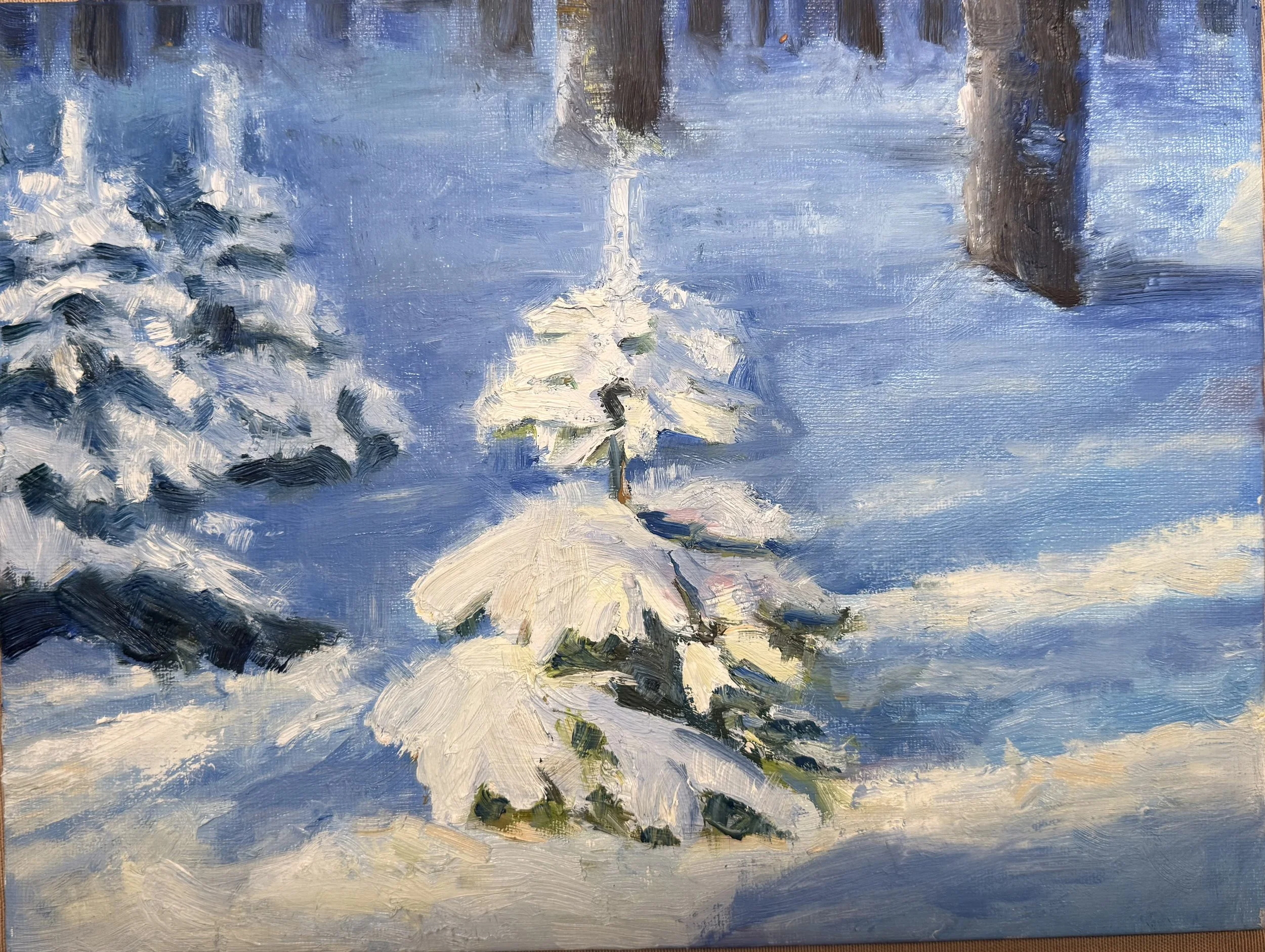 Snowlight in the Pines by Bezhan Urfonov, Oil, 9x12, $700